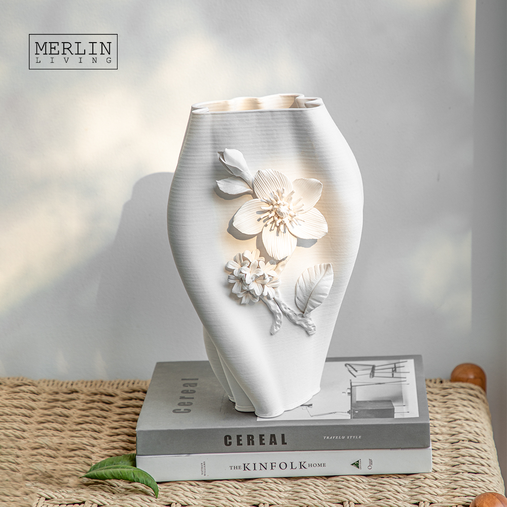 However, what really makes this vase special are the beautifully handcrafted ceramic flowers on its surface. Each flower has been carefully crafted to appear three-dimensional and vivid in nature. The flowers appear to bloom from the vase, adding a lively and vivid touch to the minimalist design. The combination of modern technology and handcraft creates a unique piece that is both contemporary and timeless.